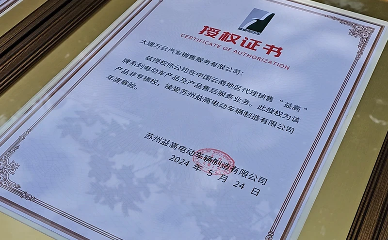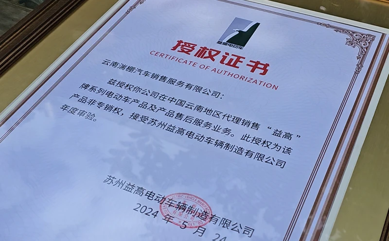 相信在苏州益高电动车辆制造有限公司的授权下,这三家公司将携手合作,共同推动“益高”品牌在云南地区的市场拓展和品牌建设,为当地消费者带来更加便捷、环保的出行方式。